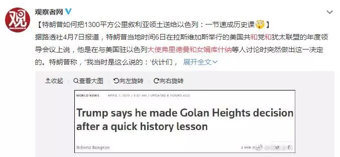 继2019年3月25日签署政府公告将戈兰高地划给以色列之后,特朗普再发惊人之语。