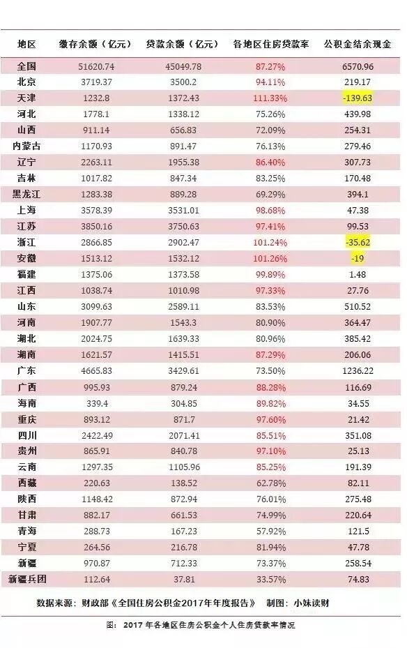 在2017年,有16个地区的个人住房贷款率超过85%,而天津、安徽、浙江三个地方的公积金余额已经不够放贷款了。
