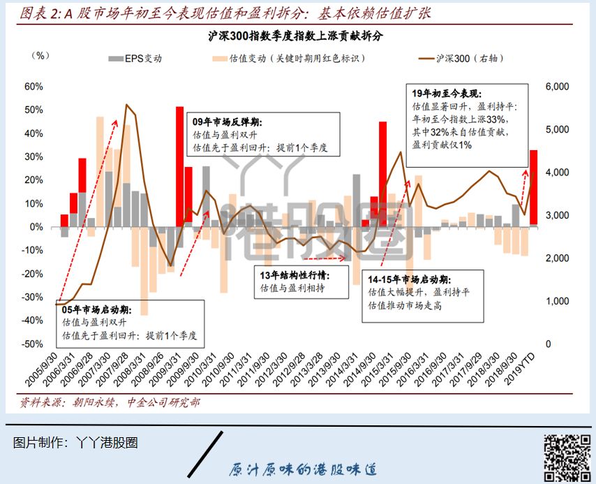 再看看估值与盈利的相对关系,可以发现,去年至今,其实盈利毫无波动,只是估值大幅下跌后,又通过估值回升涨回来。