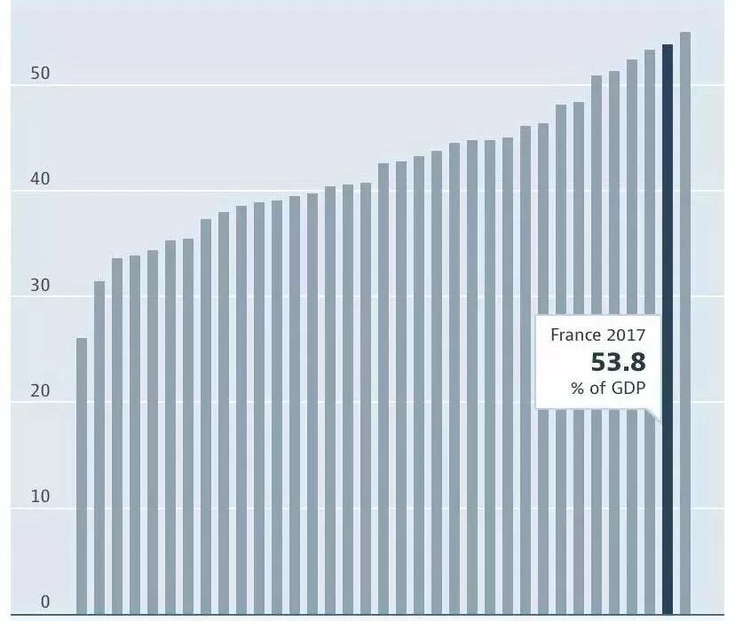 看到没有,法国的政府一般收入占GDP比例是53.8%,够高了吧,也就是说每产生100欧元的GDP,法国政府要拿走53.8欧元。