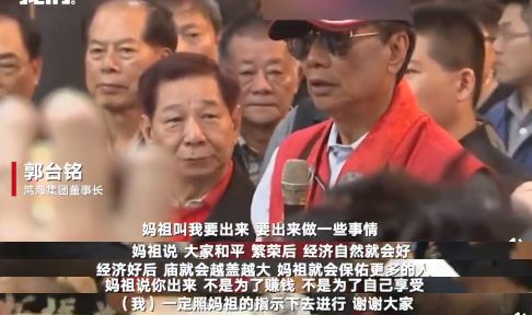更有意思的是,按照郭台铭自述,他之所以会决定参选,一方面是妈祖曾托梦给他,另一方面是关公曾两次给他指示,所以在问过关公和妈祖后,他才会最终做出参选的决定,大有一副“天命属我”的架势。