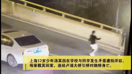 据报道,男孩跳桥当天,在学校与同学发生矛盾,事后又遭其母亲批评,于是冲下车毫不犹豫从卢浦大桥跳下去了。