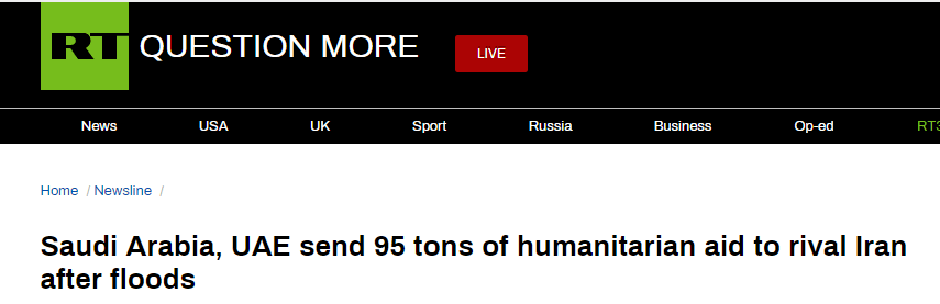 环球网消息, “今日俄罗斯”18日报道称,伊朗遭受严重洪水袭击后,沙特阿拉伯和阿联酋向其提供95吨人道主义援助物资。