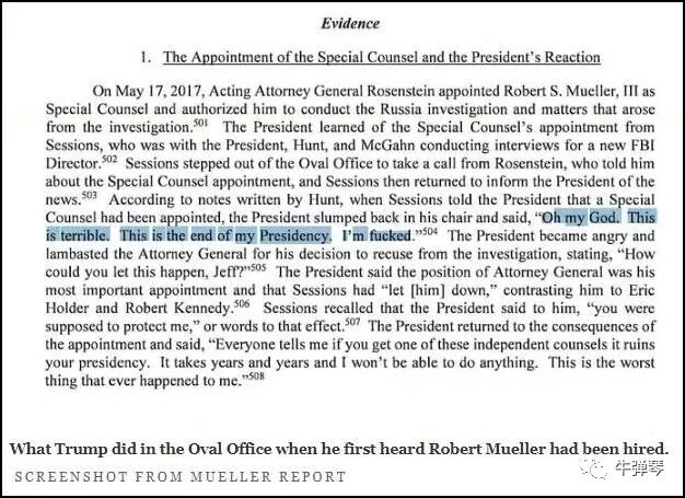 哦,原来就出自米勒的报告,就是文章开头提到的那句话:当初听到米勒将调查自己,特朗普以为自己在劫难逃了,发出这样的哀叹。