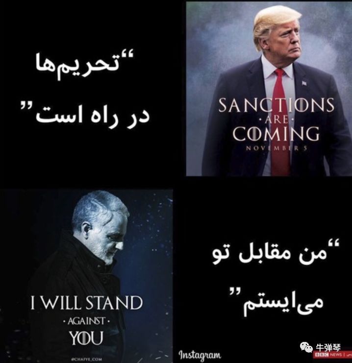 比如,特朗普推出“制裁将至”的海报后,伊朗革命卫队圣城旅司令卡西姆·苏雷曼尼,当即在Instagram上P了张照片,上面争锋相对的一行字就是:我将反对你!(I WILL STAND AGAINST YOU)