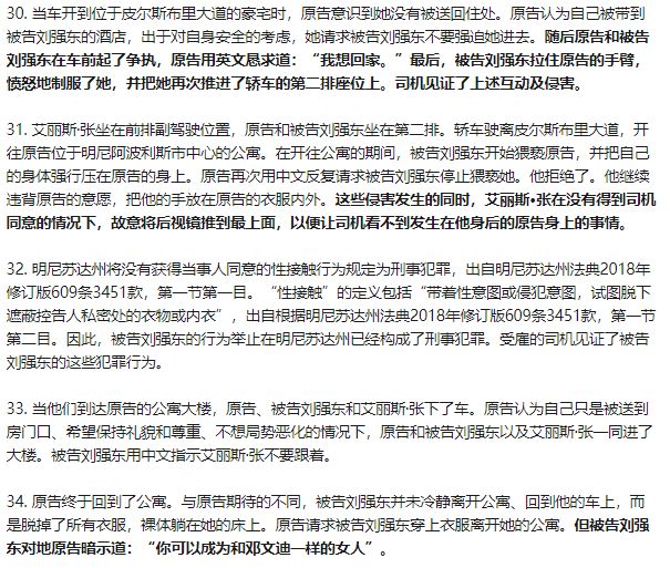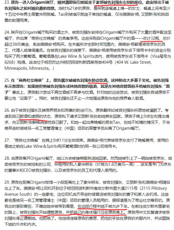 刘强东涉嫌强奸一案的具体细节,我们这些吃瓜的普通群众本来是永远无法得知的,但是在警方放弃对刘强东刑事指控之后。2019年4月16日,性侵案女主对刘强东发起了民事起诉,起诉书中女方实名(刘静尧)曝光了大量细节。