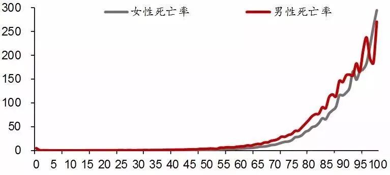 ▲图表:2015年我国不同年龄阶段男女性的死亡率(‰)