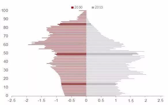 ▲图表:2015、2050年我国人口结构对比(%)