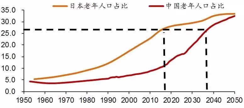 从国际比较来看,最具代表的老龄化国家是日本,当前日本65岁以上老年人口占比为27%,属于超老龄化社会。按照我国当前的速度,我们或在2037年达到日本现在的水平,到2050年的时候,中国或将与日本当时的老龄化水平相接近。