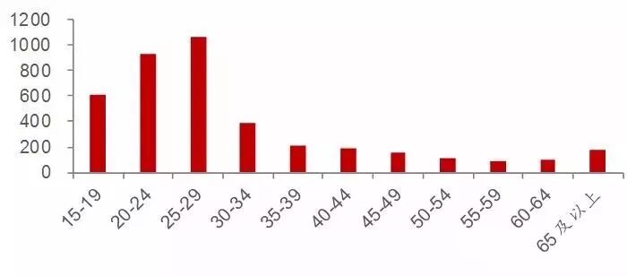 ▲图表:我国各年龄阶段“光棍儿”数量(万人)
