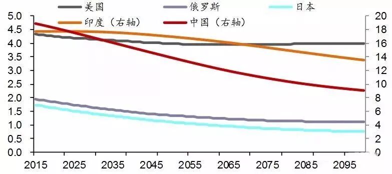 随着我国总人口增速放缓甚至出现负增长,印度将逐渐超过中国成为全球第一人口大国。根据联合国的预测,印度有望在5年后的2024年超过中国。我国人口数量在全球的占比也将逐步下降,从接近20%左右,逐渐降至本世纪末的10%以下。