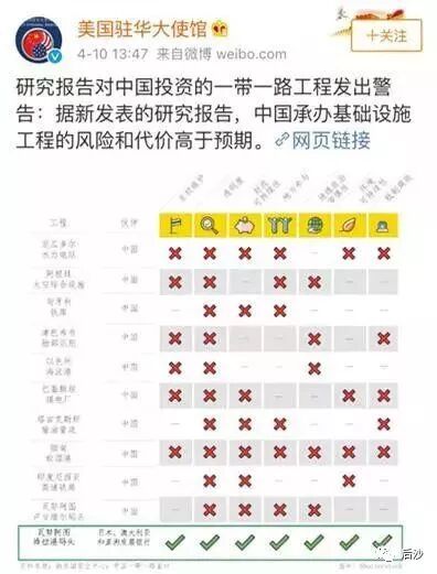 4月10日,某国驻华大使馆官微亲自上阵,给“一带一路”项目打了一片小红叉,XXXXXXXXXXX……唯有日本、澳大利亚承办的瓦努阿图维拉港码头各项指标得了一排大勾。说实话,就算搞舆论战,最好也找些智商正常的,用这种把戏诋毁中国,到底丢了谁的人?