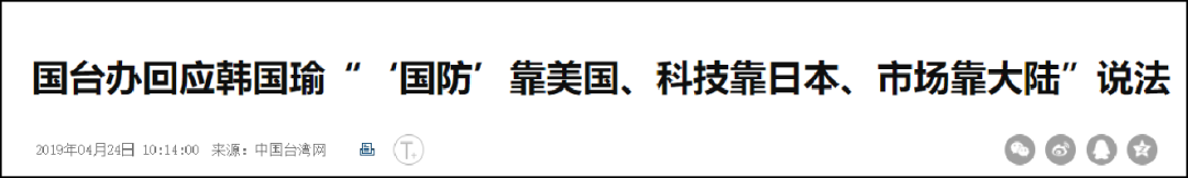 韩国瑜日前在美访问期间表示:“台湾‘国防’靠美国,科技靠日本,市场靠大陆”。