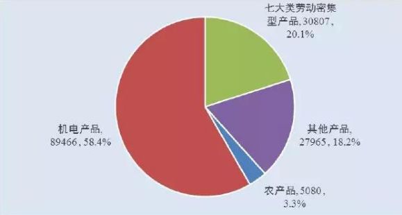 看看这些商品结构,初级产品,劳动密集型产品(以纺织业为代表)已经降到很低的比例。
