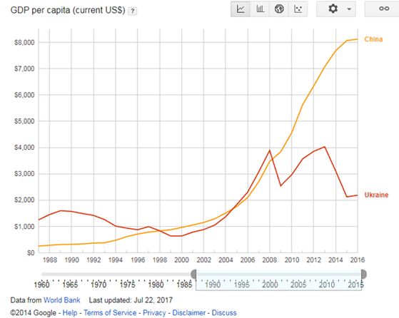 谁会想像到,曾经30年前的社会主义天堂,那个富裕程度远胜中国、还能生产各种大飞机、特种舰船的工业摇篮,如今竟然退到了这种地步!搞的我在想要找一张图能对比和中国的人均收入变化时,还一脸的不好意思: