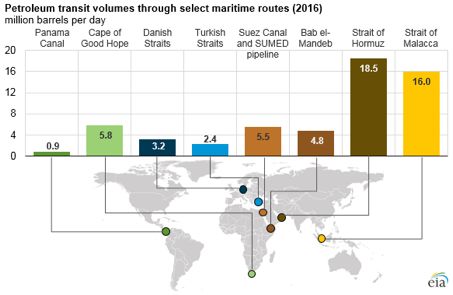 该海峡位于波斯湾的入海口,是全球海上石油运输最繁忙的中转通道,全球约20~30%的海上原油和凝析油通过此处,运往亚洲、西欧、澳大利亚、美国等世界各地。它是世界重要产油大国(如伊朗、科威特、卡塔尔、巴林、伊拉克和阿联酋)向印度洋运送原油的唯一海上通道,也是上述国家将石油运往东亚的最经济、最便捷、最有效的海上航线。