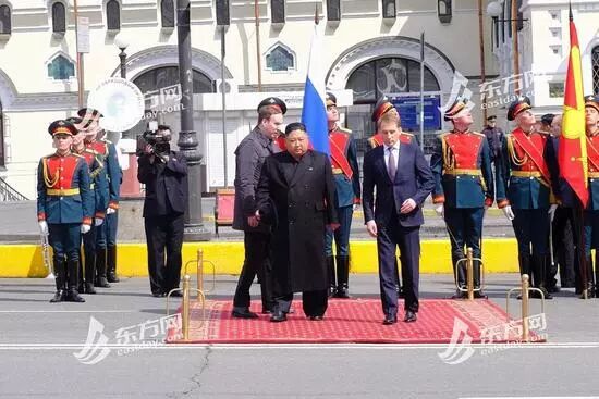东方网·纵相新闻现场看到,俄方举办欢送会,仪仗队演奏朝俄两国国歌后,金正恩检阅仪仗队,军乐团演奏朝俄传统歌曲《阿里郎》、《喀秋莎》后,金正恩一行走向站台,搭乘专列启程回国。