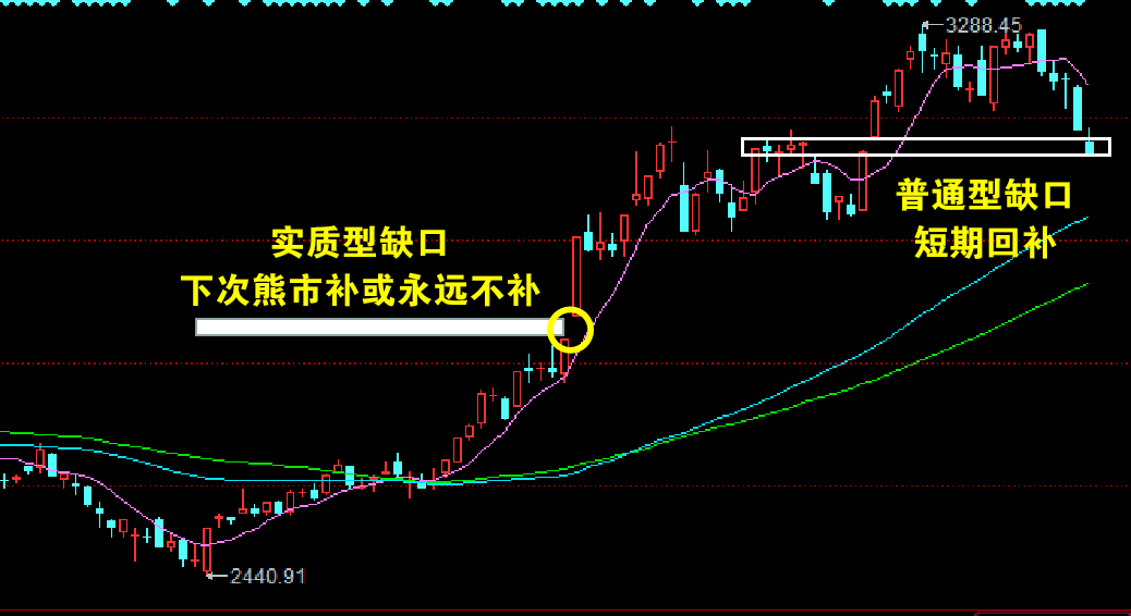 第一次出现这种缺口一般叫做“反转型”缺口,一般不会回补——回补了就挡不住了,牛市就结束了。