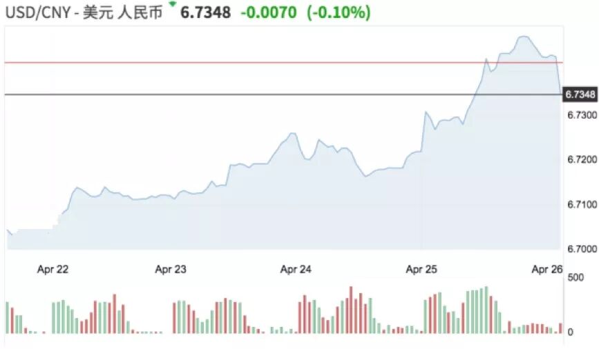 4月24日,美元指数收于98.1,创下2017年5月以来和触底88后重新走强以来的最高水平。3月20日以来,美元指数累计上涨了2%。与此同时,亚洲股市开始调整,人民币波动率也有所加剧,25日一度跌近200基点(bp),目前美元/人民币稳定在6.73上下,仍可谓是偏强的水平。