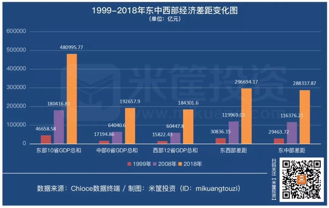 东部依旧在高速发展,与中部、西部的差距越拉越大。1999年,东西部差距3万亿,到了2018年拉大到了29万亿,足足增长了近10倍。