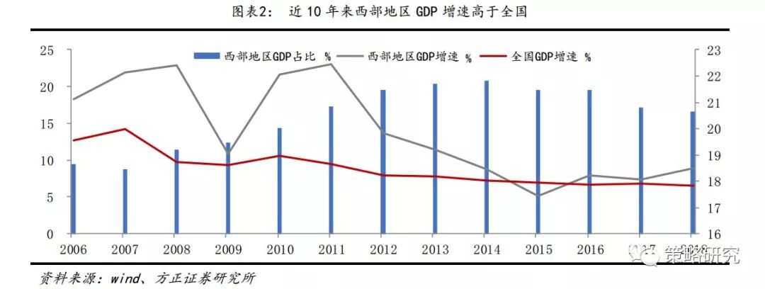 西部大开发战略提出以来,西部地区的经济增速长期高于全国整体增速,特别是2012年以来,西部的GDP年均增速达8.9%,高出全国1.8个百分点。