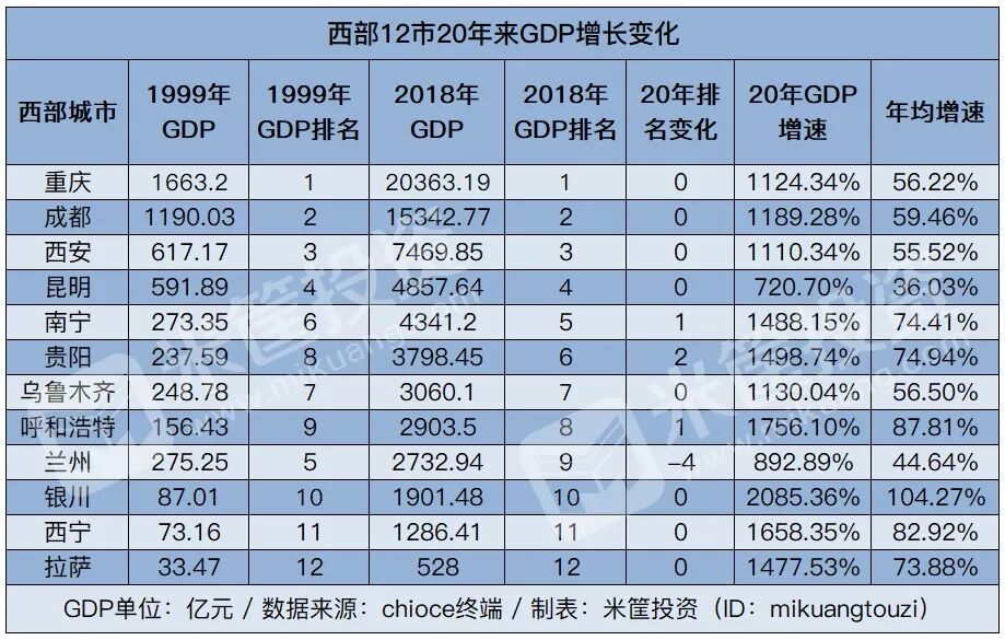 从增速来看,银川增速最快,20年间增长了20倍;其次是西宁的16倍,贵阳、南宁、拉萨都增长了14倍,看起来都是厉害的角色。
