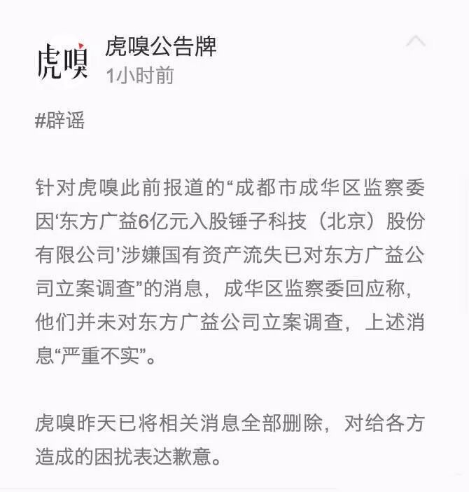 4月27日,据虎嗅APP消息,成都成华区监察委已立案调查“东方广益6亿元入股锤子科技(北京)股份有限公司”事宜,认为这个项目有国有资产流失嫌疑。4月28日,成华区监察委回应称,他们并未对东方广益公司立案调查,上述消息“严重不实”。