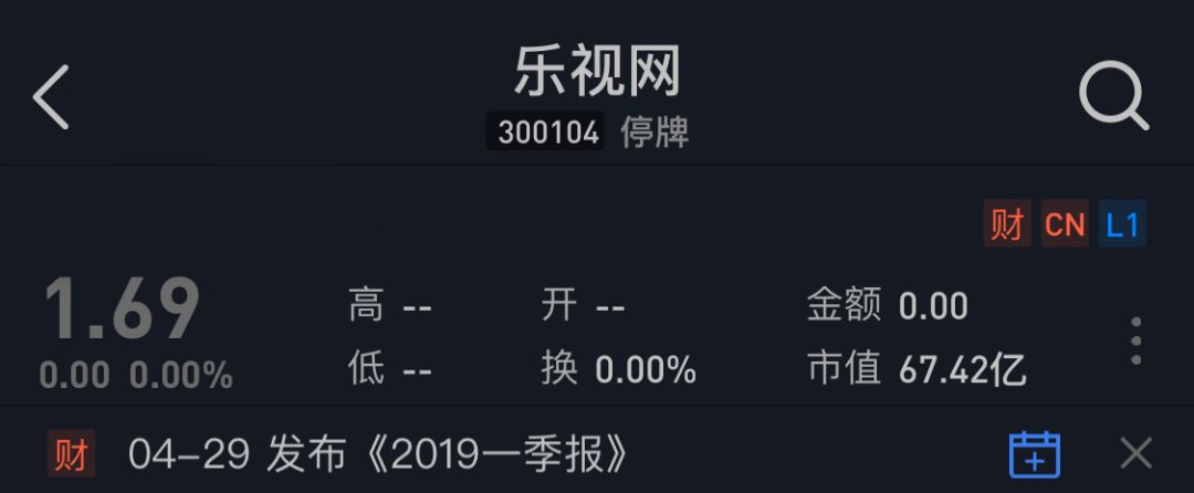 1.69元/股,乐视网的股价目前定格于4月25日的收盘价。披露2018年年报后,乐视网从4月26日起开始停牌,深交所将在停牌后15个交易日内作出是否暂停公司股票上市的决定。