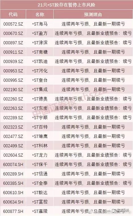 除了这21只*ST股存在暂停上市风险,还有10家年报已连续亏损两年的公司,近20家净资产为负的上市公司。