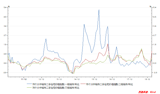 ▲一、二、三线城市二手房价格变化 数据来源:wind