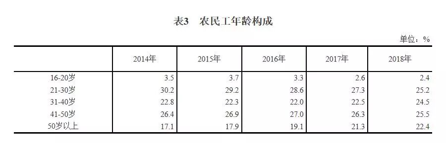 2、农民工正在不可抗拒地“变老”,50岁以上人数占比持续上升,平均年龄首次突破40岁,达到40.2岁;