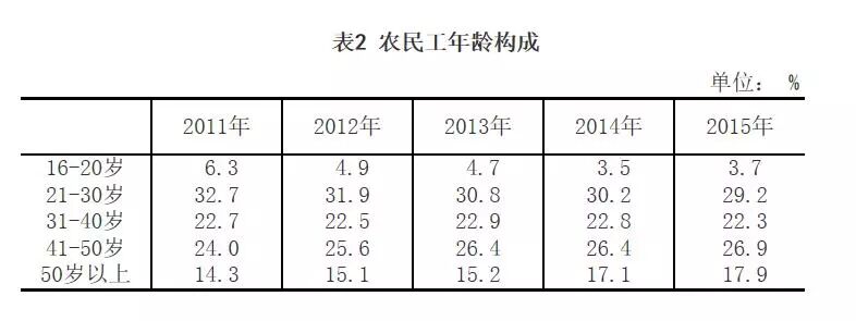 通过两个表格,我们可以看到2011年以来农民工年龄构成的变化。