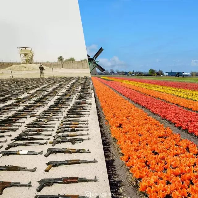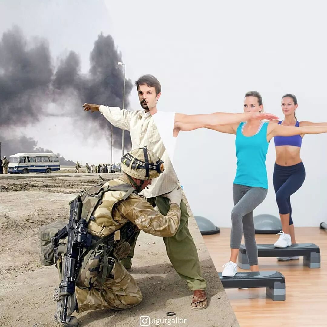 Ugurgallen说,他希望通过拼接,引起人们的思考。他希望所有人能生活在“家园和平,世界和平“这句话里。
