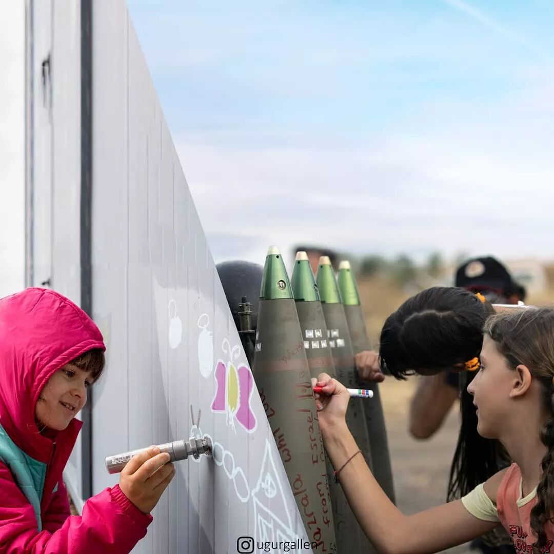 右边的女孩们在2006年以色列-黎巴嫩战争期间,向炮兵部队的炸弹发送信息;左边的小女孩因战争而不得不逃离她的国家的女孩,正在希腊难民营的墙上涂鸦。