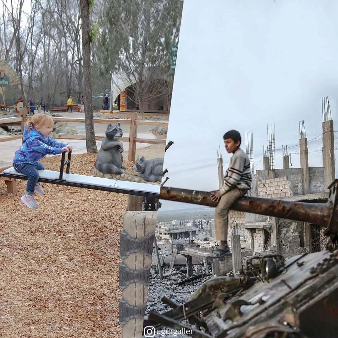 跷跷板的两端是两个世界:一头是岁月静好、幸福洋溢;一头只有断壁残垣和不知道会不会到来的明天。
