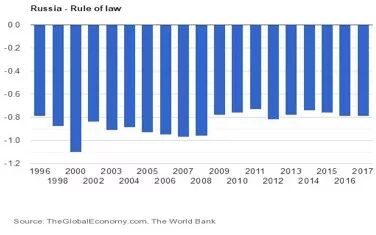 根据世界银行编制的法治指数,2017年俄罗斯的得分为-0.79,在参与排行的193个国家和地区中名列第148名,可见其法治水平之低。该指数反映了民众对社会规则的信心和遵守程度,包括该国合同执行质量、财产权的受保护程度、警察和法院的治理水平,以及犯罪和暴力事件的发生率等等。