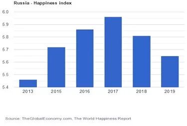 幸福排名是世界幸福报告的一部分。国家的得分是基于一项调查得出的,在这项调查中,受访者对他们目前的生活质量进行了0至10分的评估。2019年俄罗斯的得分是5.65,与巴基斯坦的分数一样,全球排行第66位。