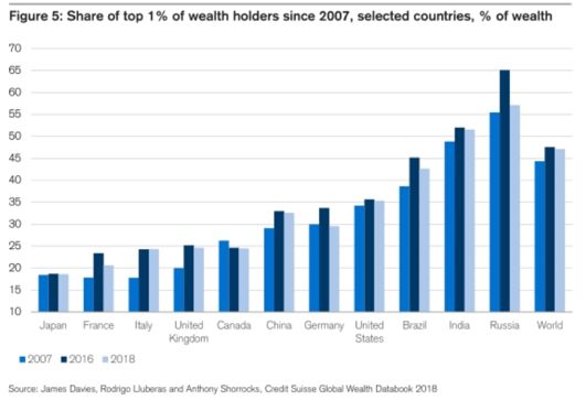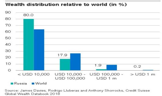 据瑞信《2018年全球财富报告》,俄罗斯是全球财富分配最不均衡的国家。2018年1%最富有的人手中掌握着超过全国56%的财富,而全球平均数为47.2%。