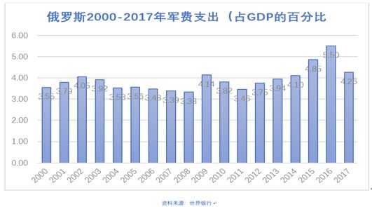 但常规军备方面,不管俄罗斯如何加大支出,也难保第二军事强国的地位。因为军费支出同为GDP的4%,2017年美国的军费开支是6097.58亿美元,俄罗斯是663.34亿美元(中国军费支出仅为GDP的2%,但也折合2282.30亿美元,现代社会中,军事力量长期取决于经济实力),二者相差九倍。昔日苏联综合国力强于今日之俄罗斯,尚且被军备竞赛拖垮,何况今日经济体弱的俄罗斯?