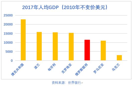 从最新的数据看,东欧及前苏联等指令经济转轨的国家中,俄罗斯人均GDP已经处于中等偏下水平,波兰、匈牙利等国2017年的人均GDP已经超过了15000美元,捷克更是达到了22779.29美元,近乎俄罗斯的一倍,把俄罗斯远远甩在了后面。