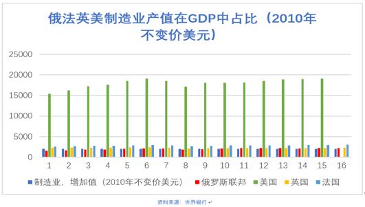 显而易见,俄罗斯是因资源诅咒而罹患“荷兰病”的重症患者。丰富的油气资源使得国民经济其他部门受到挤压,苏联时代的重工业和军工产业已经基本衰败,2017年俄罗斯制造业在GDP占比不足12%,产值仅有2174.02亿美元,而2016年美国的制造业产值为19137.86亿美元(同为世界银行2010年不变价美元)。