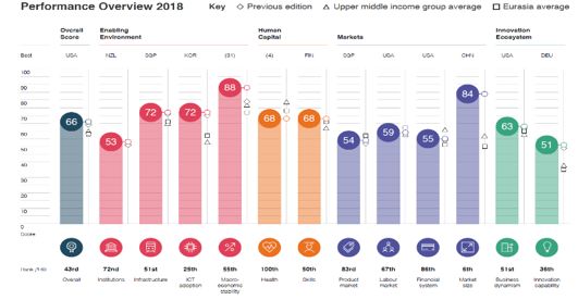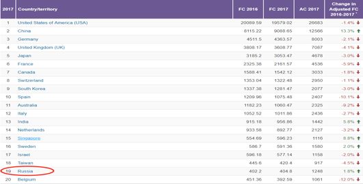第三个角度是,在《全球竞争力报告2018》中,俄罗斯的综合排名是第45名,其中创新支柱中,创新能力的排名为全球34,而商业转化的排名仅为全球第51,可见俄罗斯在商业驱动的创新能力已经掉出了国际第一梯队。