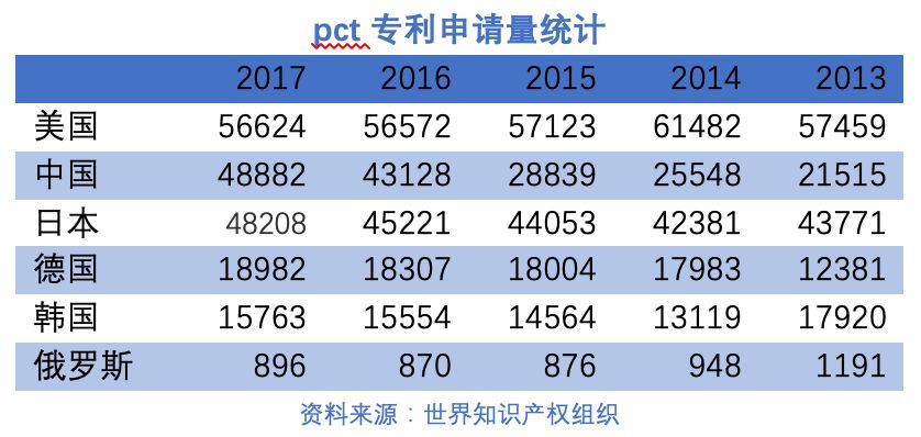 第一,从PCT专利申请量来看,最近5年俄罗斯在世界产权组织申请的PCT专利数量已经变得非常微不足道。2017年与排行前五的国家相比,俄罗斯的全年申请量只有896件,而排名第五的韩国的申请量是15763件,是俄罗斯的17倍。