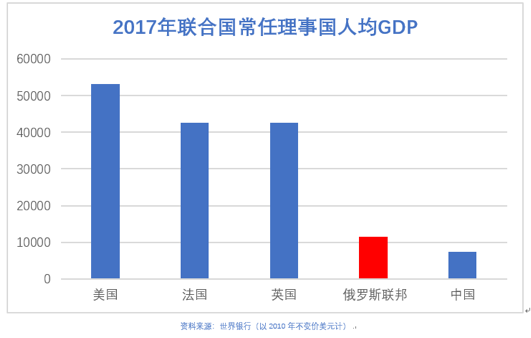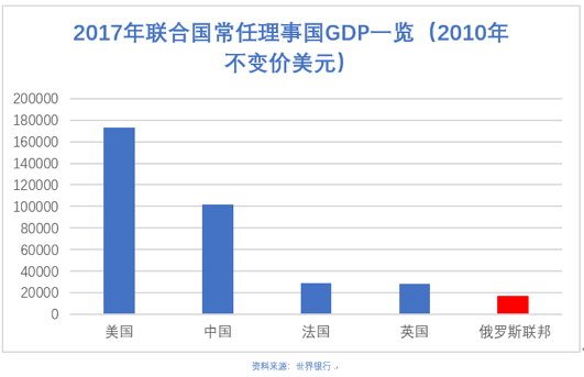同口径下,俄罗斯联邦的GDP是现在联合国五个常任理事国中最低的,只在人均GDP上领先中国。