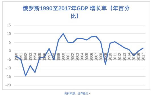 2000年,即普京执政首年,其GDP增速是俄罗斯近30年的最好记录,达到了创纪录的10%,到2009年则出现了大幅负增长,并形成了“大起大落,整体向下”的格局。