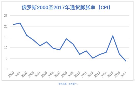 按消费者价格指数衡量的通货膨胀率来看,普京执政之下的俄罗斯发生恶性通胀是常态,2000年至2017年18年间,最低的通货膨胀率是2017年的3.68%,而有10年的通货膨胀是两位数以上,18年加总起来的通胀率为660.4%。