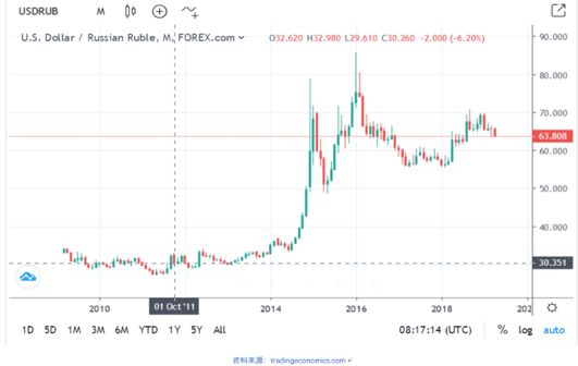 从过去10年的趋势看,卢布对美元处于贬值通道之中,但波动幅度在逐年收窄。2018年在美联储收紧货币政策的冲击下,卢布约贬值了20%。年初开盘是1美元对57.6卢布,年终收盘是1美元对69.2卢布。