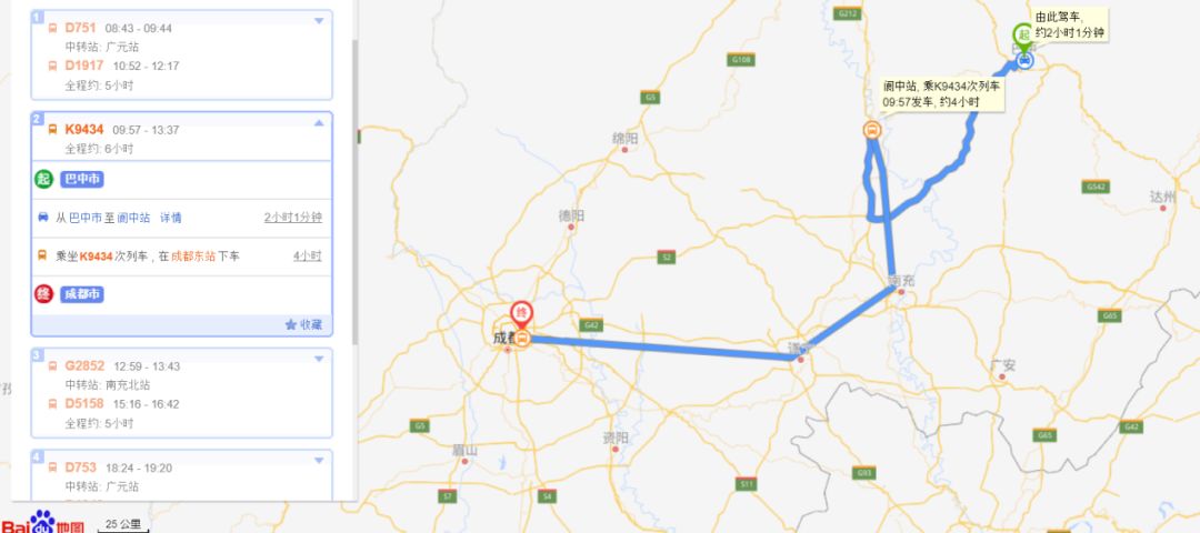 图3:从巴中到成都至少需要中转1次汽车、1次火车