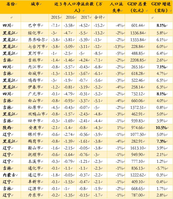 *注:人口流失率=近3年流出人口/2014年基期人口数量,部分城市未公布2018年GDP数据,因此统一采用2017年GDP总量及增速。