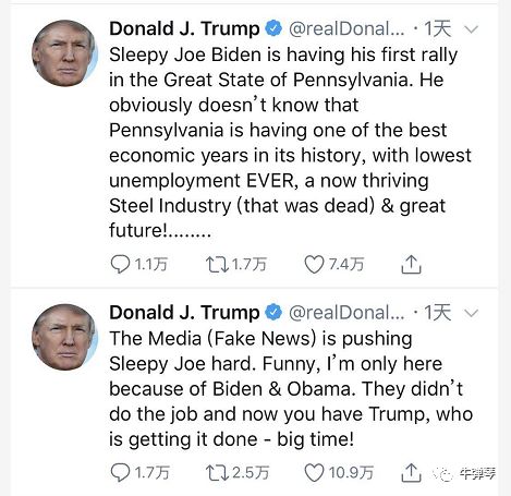 面对最强劲的对手,面对这样的抨击,在白宫里的特朗普坐不住了,赶紧发推特,其中一条这样写道: